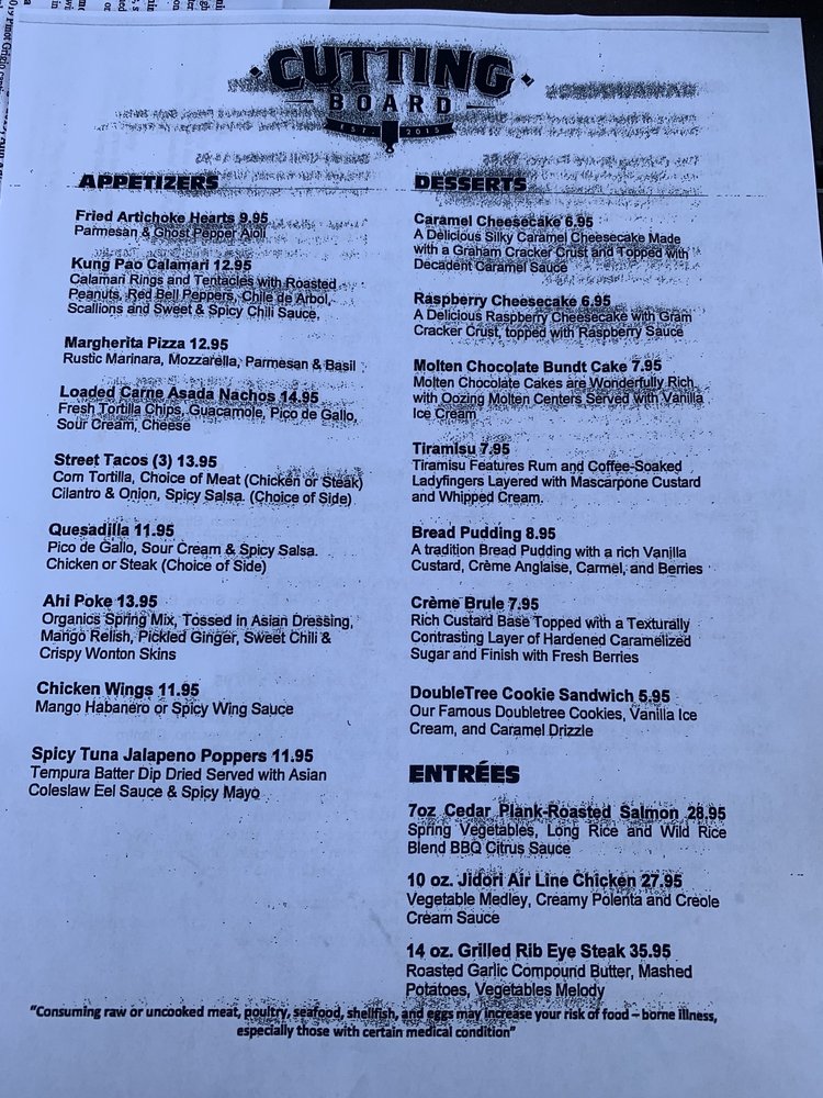 Welcome to The Cutting Board Restaurant & Bar, a hidden gem nestled within the DoubleTree Hotel in San Bernardino. This New American dining destination boasts a diverse menu designed to cater to all palates, featuring an array of vegan and vegetarian options alongside mouthwatering meat dishes. Guests rave about the bone-in buffalo wings and the delightful mango habanero sauce, perfectly balancing sweetness and spice. The steak nachos and dip are standout favorites, praised for their rich flavors and tender ingredients.